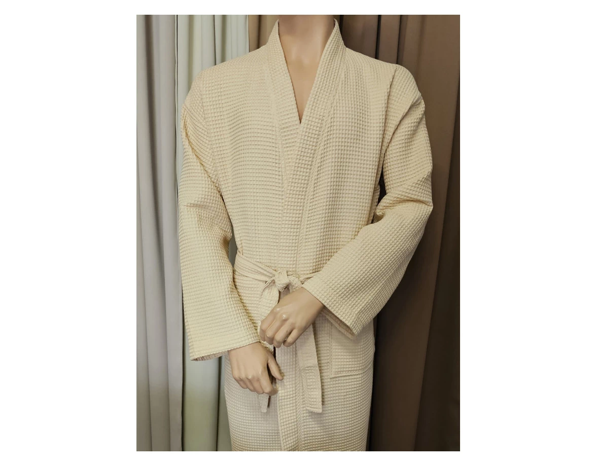 Bavlněný unisex župan béžové barvy ušitý ve volném a pohodlném kimono střihu. Přední část županu doplňují dvě kapsy a stahuje se páskem.