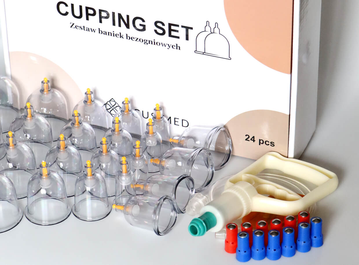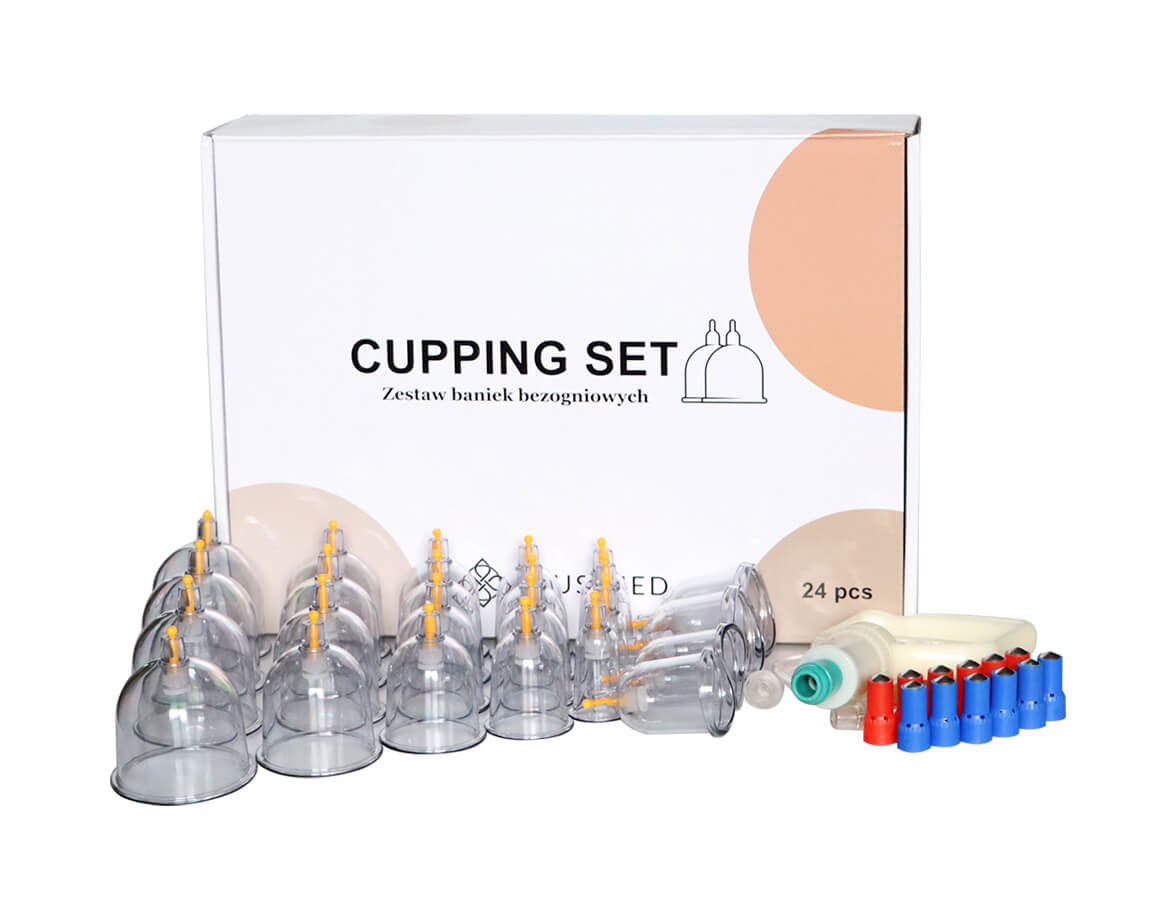 Součástí balení je pumpička o délce hadičky 65 cm pro vytvoření podtlaku a set doplňují gua sha škrabka pro detailní ošetření problematických míst a 12 magnetických nástavců pro kombinování baňkování s magnetoterapií.