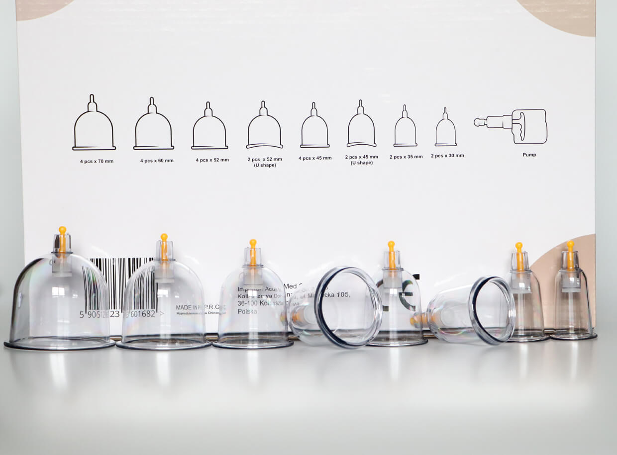 Vakuové baňky v šesti průměrech od 3 po 7 cm ve dvou tvarech: klasický tvar a tvar U, na kterém spodní okraj baňky je tvarován pro lepší přilnutí na členitých částech těla.