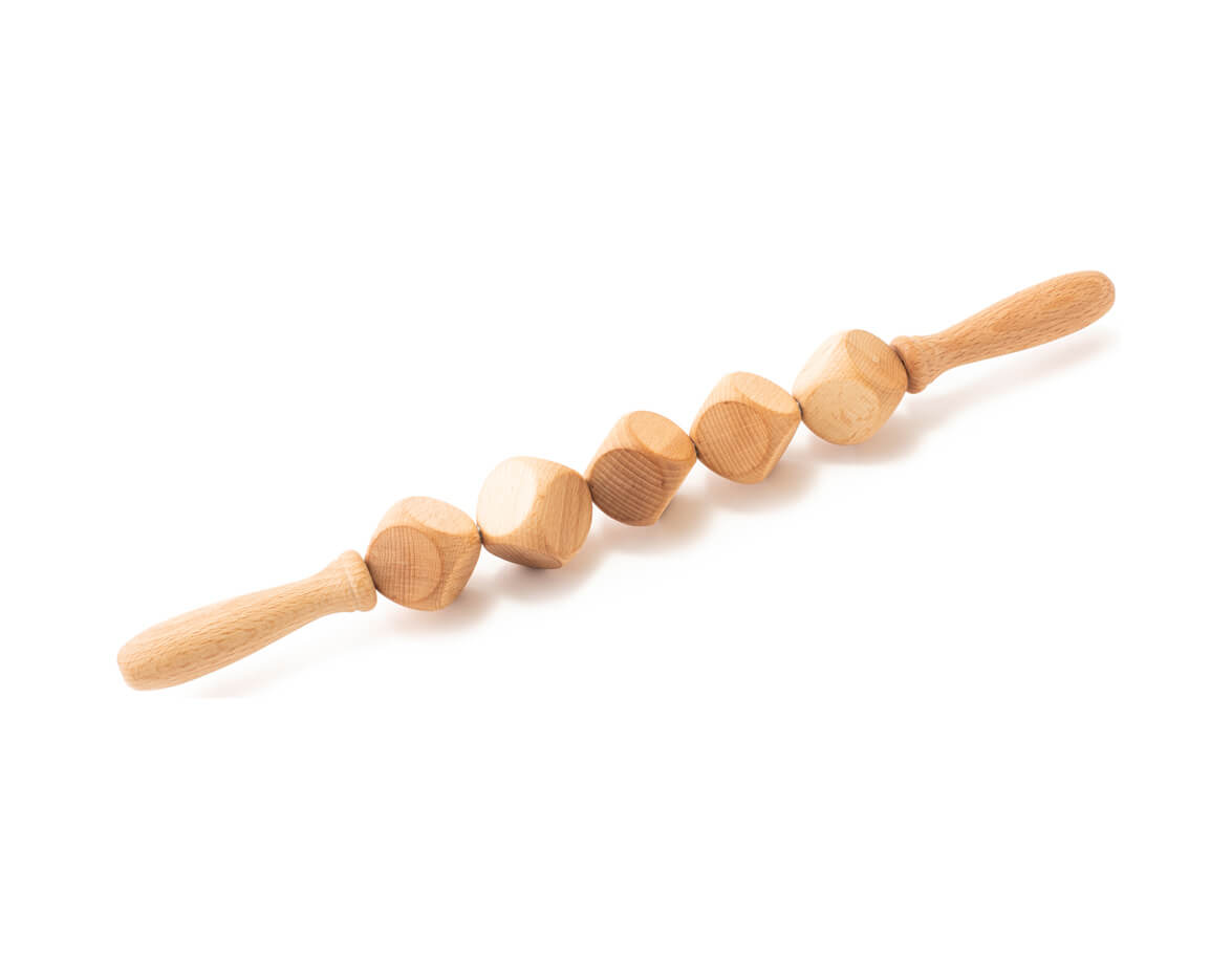 Masážní váleček složený z 5 kostek se zaoblenými hranami z bukového dřeva. Tvarované rukojeti příjemně padnou do dlaní. Váleček je vhodný k masážnímu ošetření problematických partií těla s výskytem vyšší vrstvy podkožního tuku, celulitidy nebo povolené kůže, jako jsou stehna, hýždě, bříško, boky a paže.