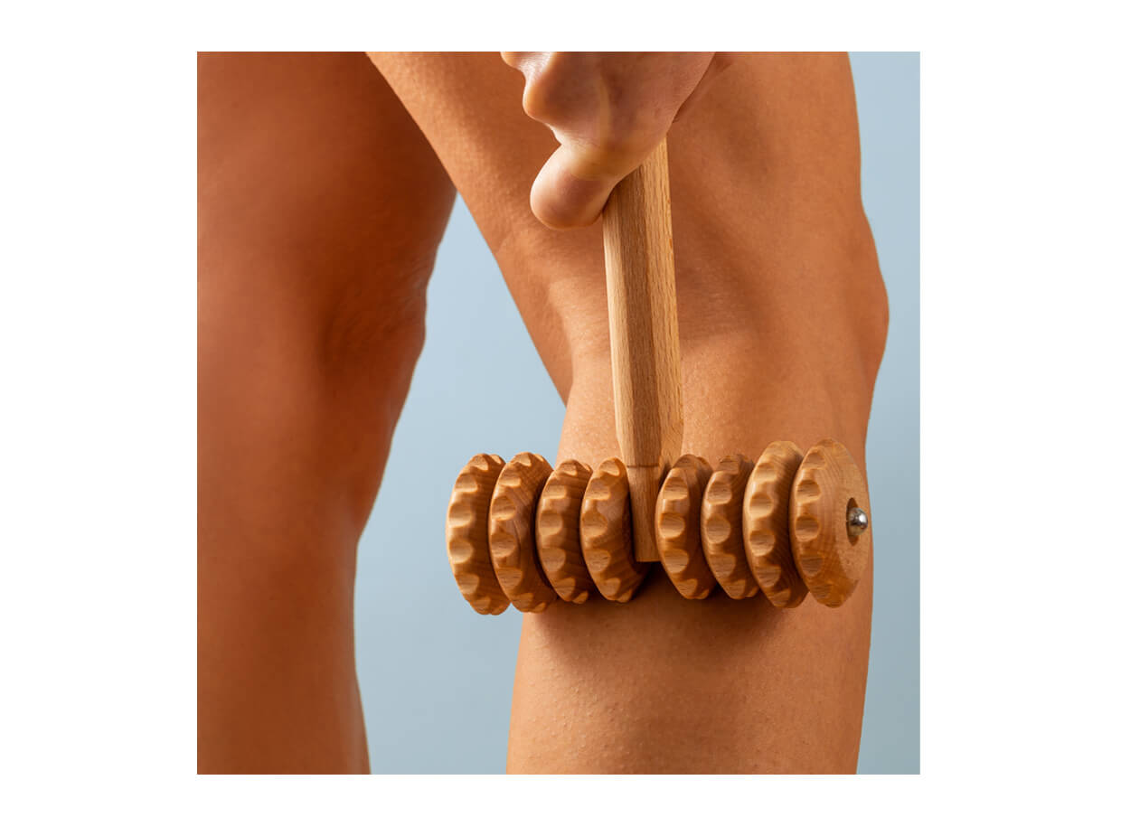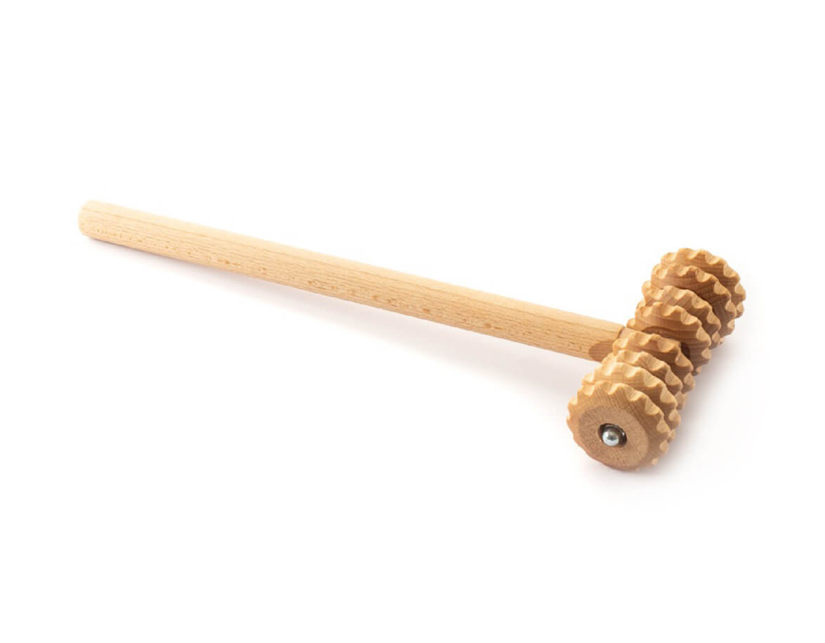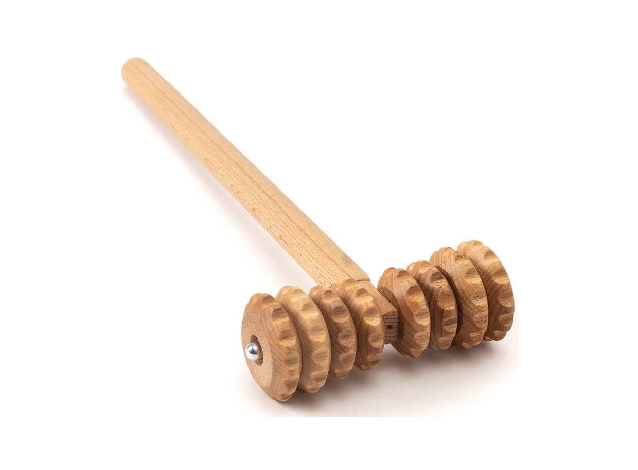 Masážní váleček ve tvaru T s rukojetí a 8 ozubenými kolečky z bukového dřeva. Rukojeť umožňuje vyvinout přiměřený tlak při masáži a dosáhnout pohodlně i na méně dostupné partie těla při automasáži. Váleček je vhodný k ošetření problematických partií těla s výskytem vyšší vrstvy podkožního tuku, povolené kůže nebo celulitidy.